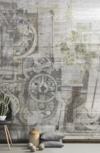Ingranaggi, architetture, schizzi, oggetti vintage e ricordi. Le pareti fanno rivivere un’epoca passata e atmosfere immaginarie dal sapore industriale create dai designer di WallPepper nella nuova collezione Postmodern.