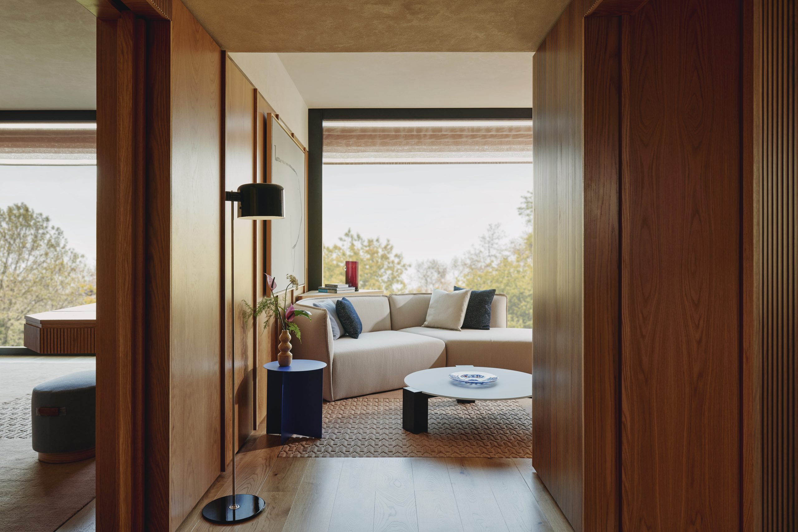 Lungo i corridoi invece, una “passatoia” realizzata con il tappeto Albers sempre di Paolo Zani, che rende omaggio proprio ad Anni e Josef, la coppia creativa del Bauhaus che gettò le basi del modernismo.