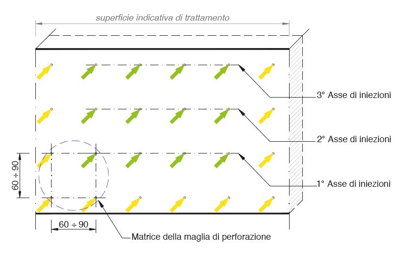 Esecuzione dei fori d’iniezione da 12 mm per tutto lo spessore della struttura controterra al fine di raggiungere il terreno a tergo della stessa.