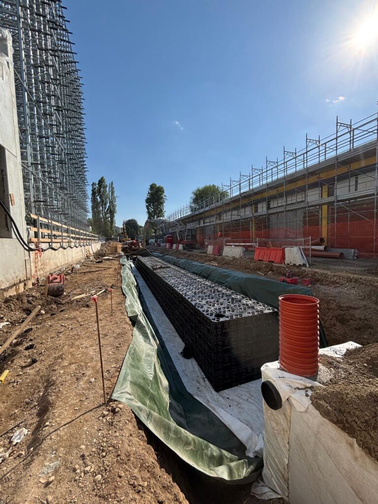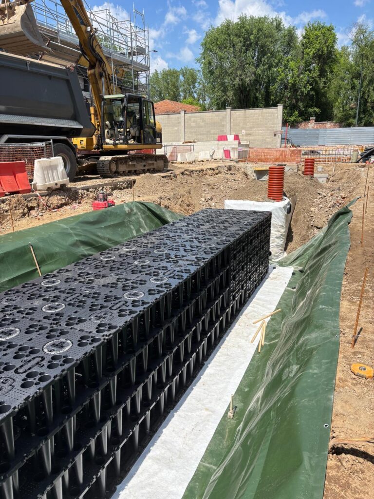 Per mitigare il rischio di deflussi superficiali causati dalla nuova urbanizzazione, l’impresa Locatelli Lavori Stradali ha implementato una soluzione avanzata per la gestione delle acque piovane.