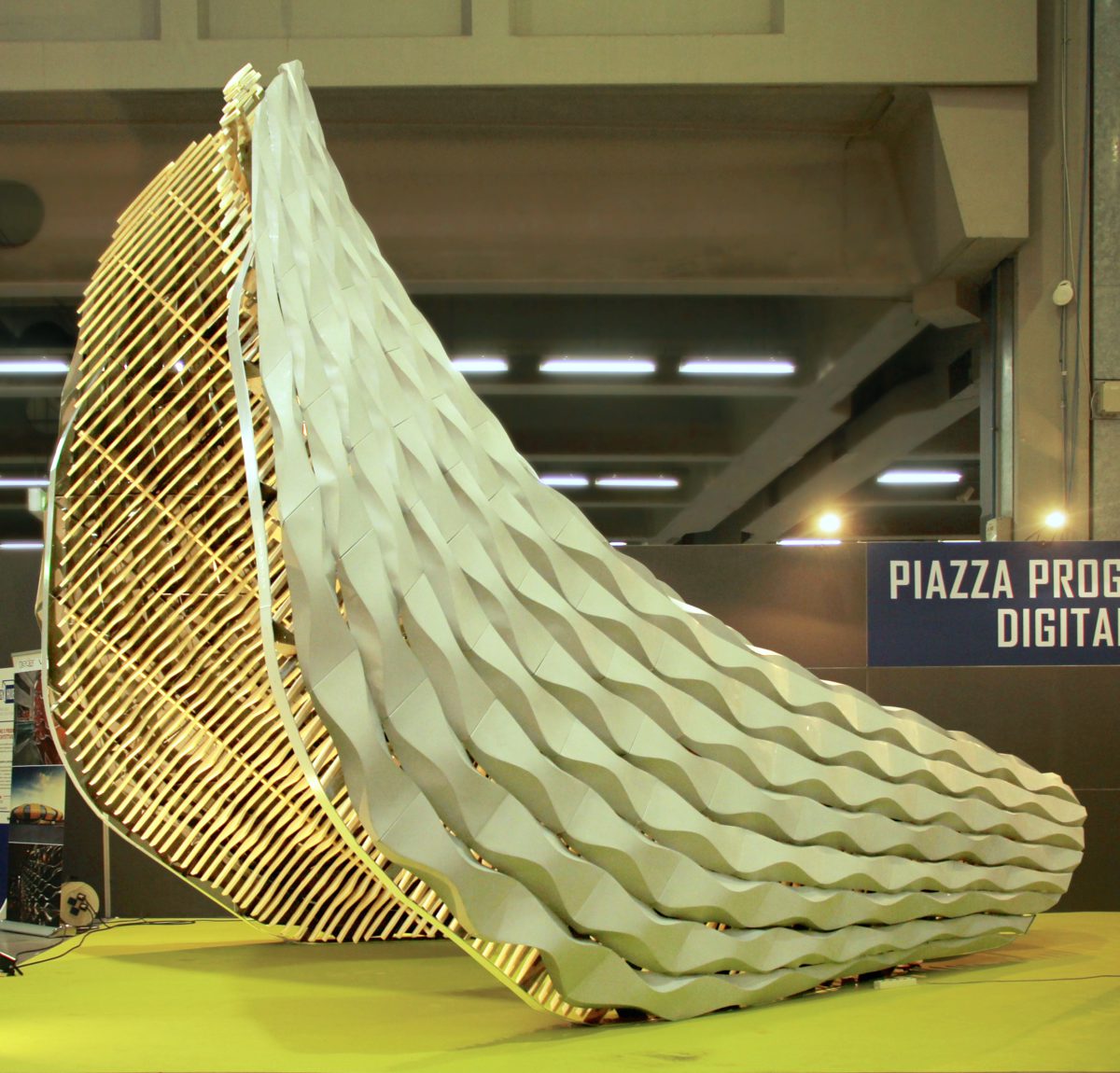 Doppia curvatura in acciaio. L’installazione, autentica contaminazione tra design, architettura e arte, trae la sua forza espressiva dall’analogia con l’immagine dell’onda, che permea il design dalle fasi volumetriche di progetto al pattern generato sulle superfici. Si compone di una struttura in doppia curvatura in acciaio che sostiene due eleganti ali, ricoperte internamente con listelli di legno ed esternamente con pannelli in zinco-titanio ondulati. Ne risulta un landmark ad alto impatto estetico-funzionale.