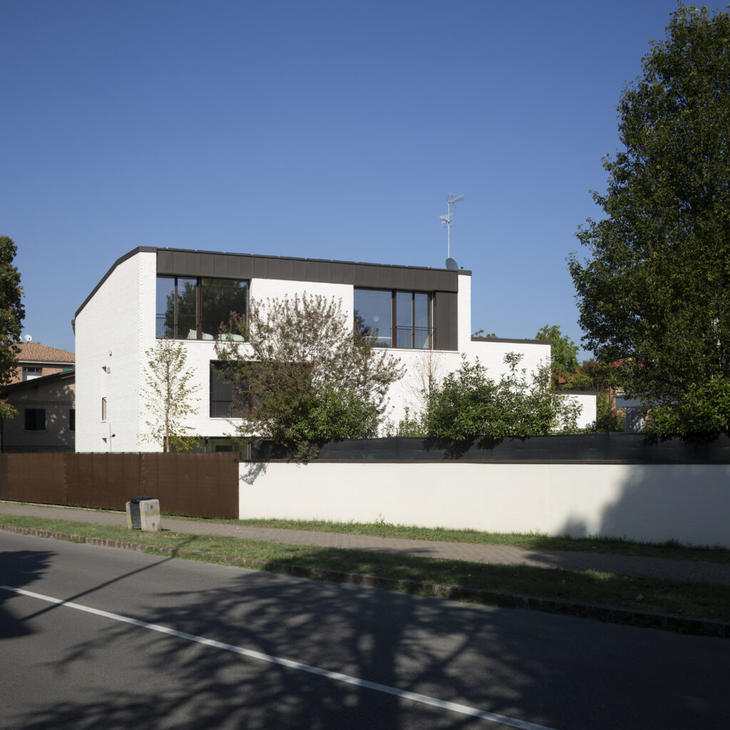 La casa si presenta con tre “volti” distinti. A nord, dove si trovano gli accessi pedonale e carrabile, l’edificio restituisce un’immagine domestica e rassicurante, con aperture regolari e falde aggettanti che evidenziano la progressione dei volumi. Sul fronte ovest, allineato alla strada, la casa assume un carattere urbano e introverso: il volume più alto, su tre piani, mostra poche aperture verticali destinate agli ambienti di servizio, mentre la muratura compatta protegge dal traffico e dal rumore. Sul lato sud, affacciato sul giardino, la casa si apre alla dimensione privata, con solarium e piscina al centro della vita familiare e ampie portefinestre che collegano soggiorno e zona pranzo.
