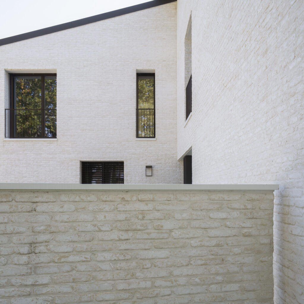 Il volto esterno della casa è caratterizzato dall’uso di un solo materiale: il mattone facciavista, burattato e scialbato, Dogi 2.0 scialbato SanMarco di wienerberger, posato con giunti a malta di calce della stessa cromia della scialbatura, che genera un effetto vibrante e sottolinea l’articolazione volumetrica. La struttura portante è in calcestruzzo armato con solai misti, mentre l’involucro ad alto spessore integra isolamento e sistemi in acciaio, garantendo efficienza energetica e solidità costruttiva.