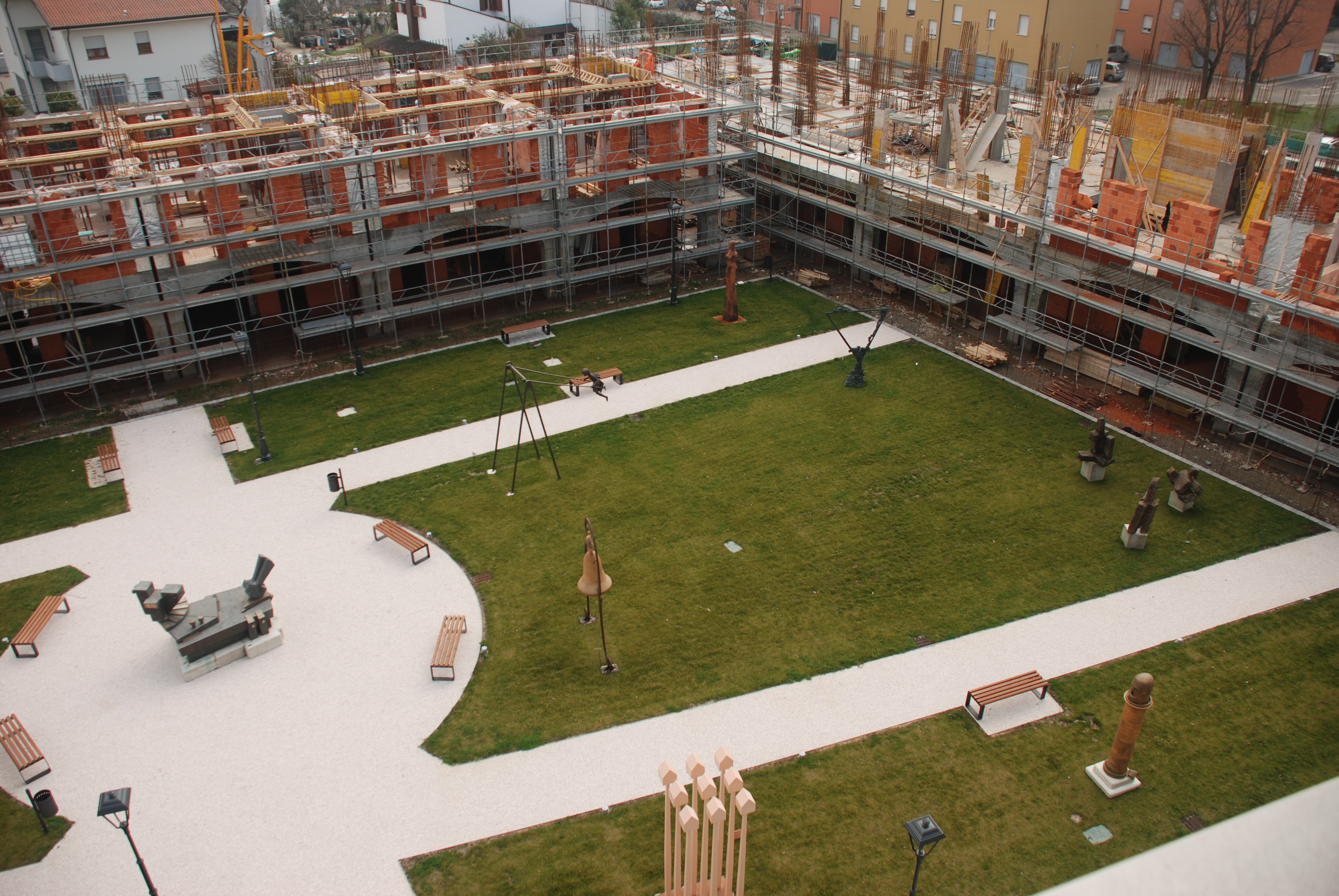 «Il punto di partenza del progetto – sottolinea l’Ing. Venturi che firma il progetto insieme agli ingegneri Fabio Paoletti e Fabrizio Campanini – è la piazza. Piazza intesa come luogo di aggregazione e di incontro. Si è pensato di riproporre un brano di città che andasse a completare e raccordare il museo Magi ‘900 con il tessuto urbano di Pieve di Cento, attraverso la creazione di un “giardino delle arti” nel quale tutti possono incontrarsi e passeggiare perché protetto da portici e popolato di opere. Per questo il progetto urbanistico nasce unitario. Gli edifici residenziali, come nelle migliori piazze delle città tradizionali italiane ed europee, cingono il giardino delle arti creando una quinta scenica ma discreta alla galleria d’arte e alle sue opere che escono dal museo andando ad animare la grande piazza giardino».