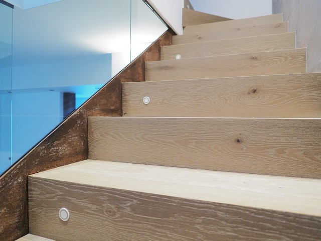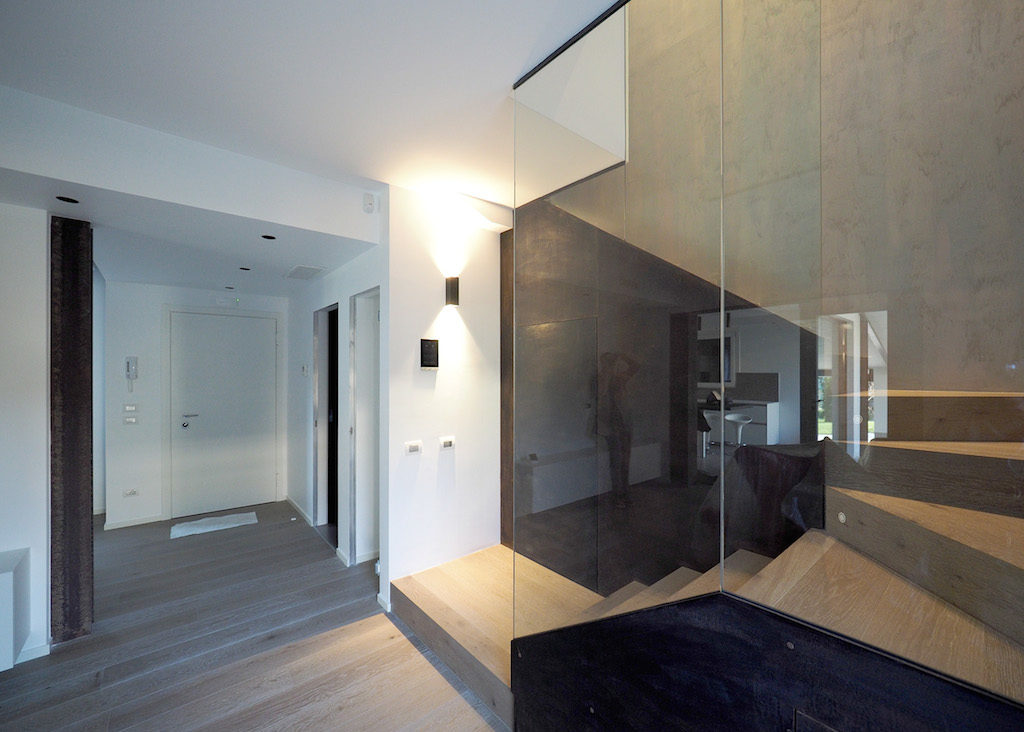 Il parquet in rovere termotrattato all’ingresso fa parte della collezione Alpen Parkett One di Woodco, nella variante Louis. Il pavimento in legno riveste anche la suggestiva scalinata che porta al piano superiore, creando contrasti materici e di colore abbinati al metallo opaco e ai parapetti in vetro.