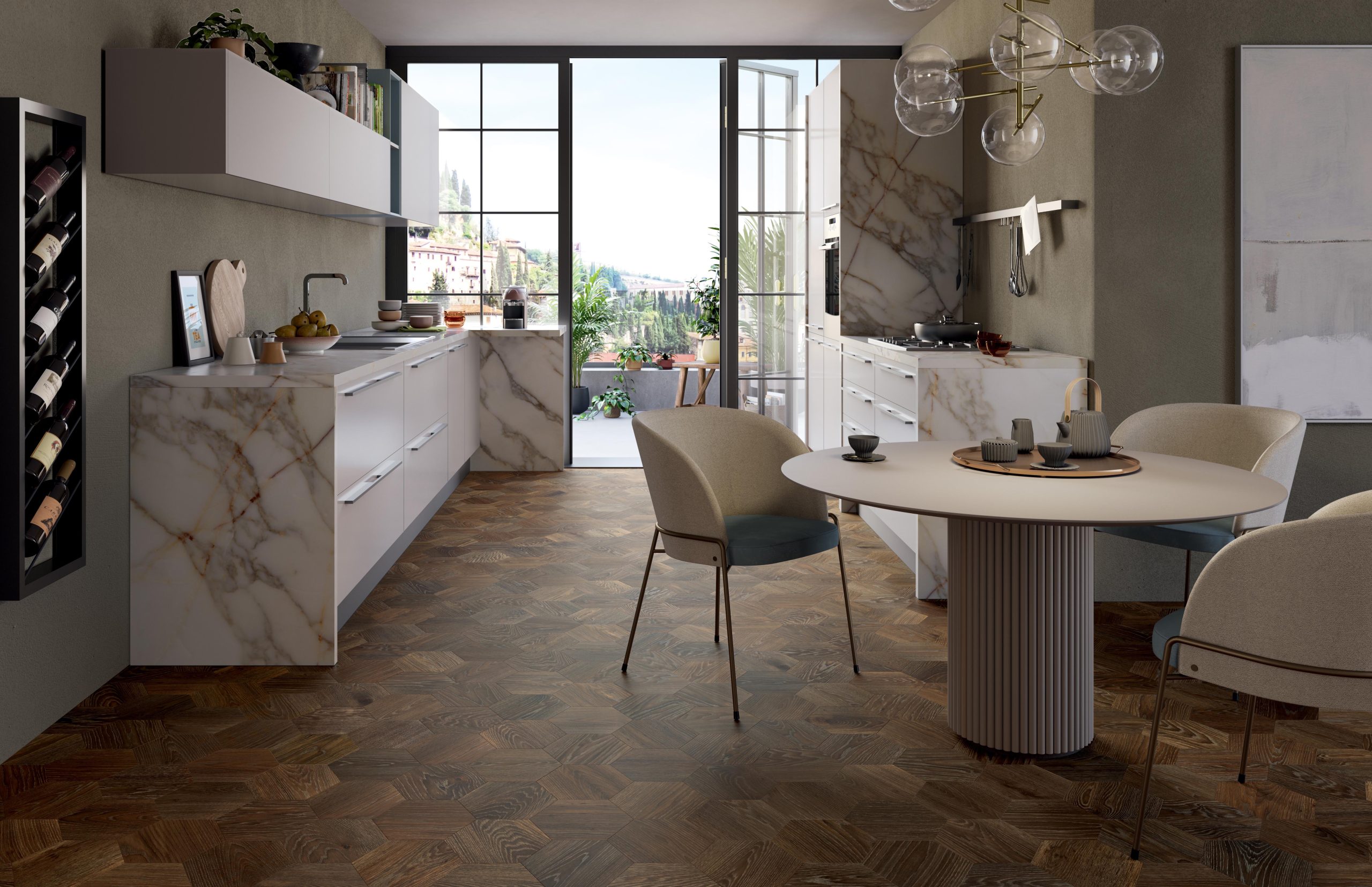 Ogni esagono si integra infatti con l’altro in un disegno armonioso e allo stesso tempo fluido, restituendo una trama a nido d’ape che proietta la luce in modi inaspettati ed enfatizza la tridimensionalità e la profondità degli ambienti.