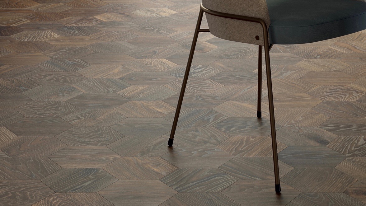 Il formato Esagono di Woodco interrompe la linearità delle venature del legno proiettandole in ogni direzione