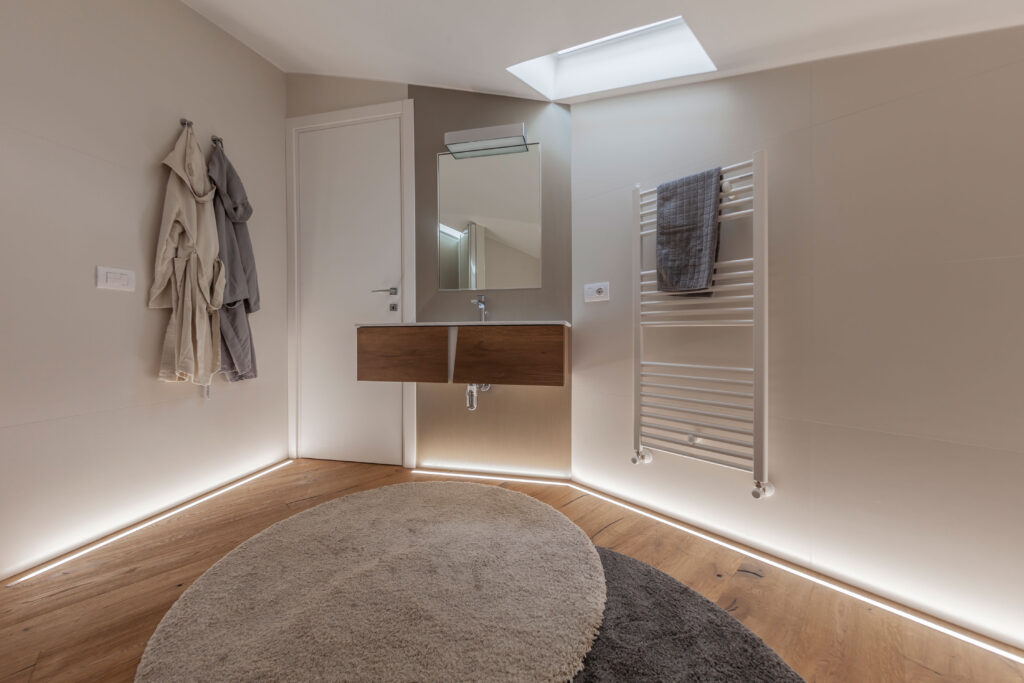 A fare la differenza per un pavimento è la scelta del giusto modello. Per il bagno è meglio optare per un parquet prefinito e scegliere una posa incollata con sigillatura del perimetro. Tra le essenze più indicate troviamo doussié, iroko e teak per la loro stabilità a contatto con l’acqua, ma anche il rovere. La finitura verniciata deve proteggere la superficie dagli urti e tutelare il pavimento dai liquidi e dalle macchie.