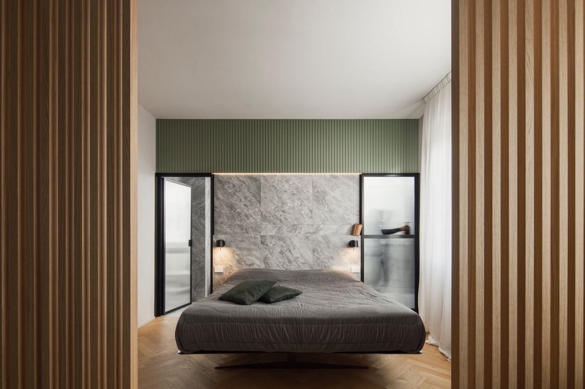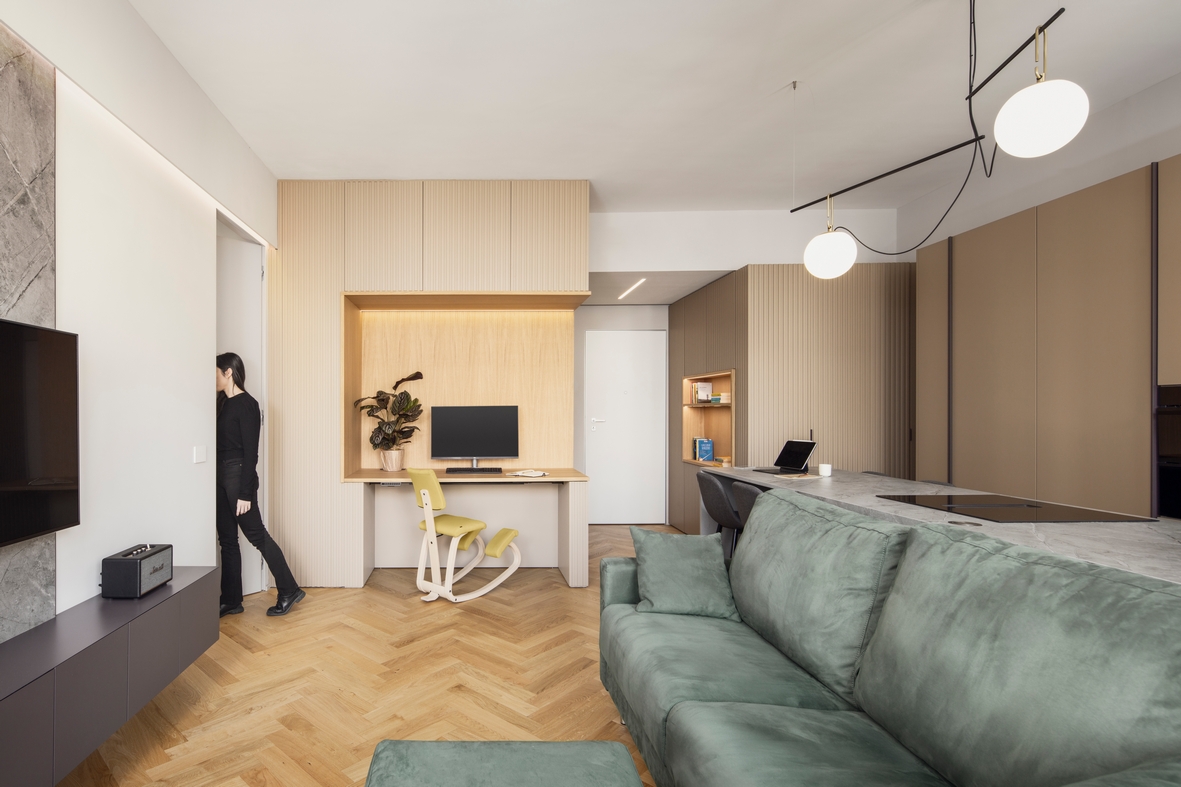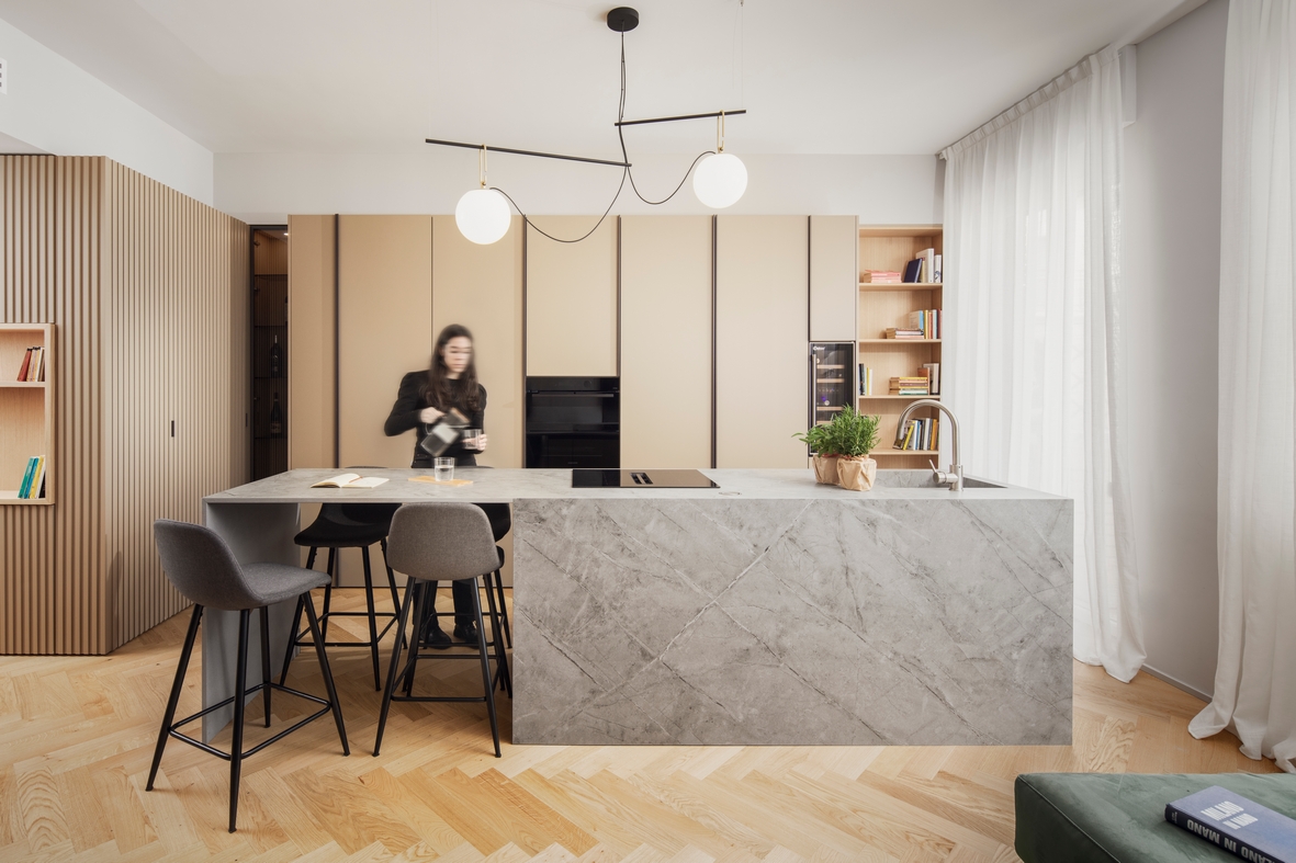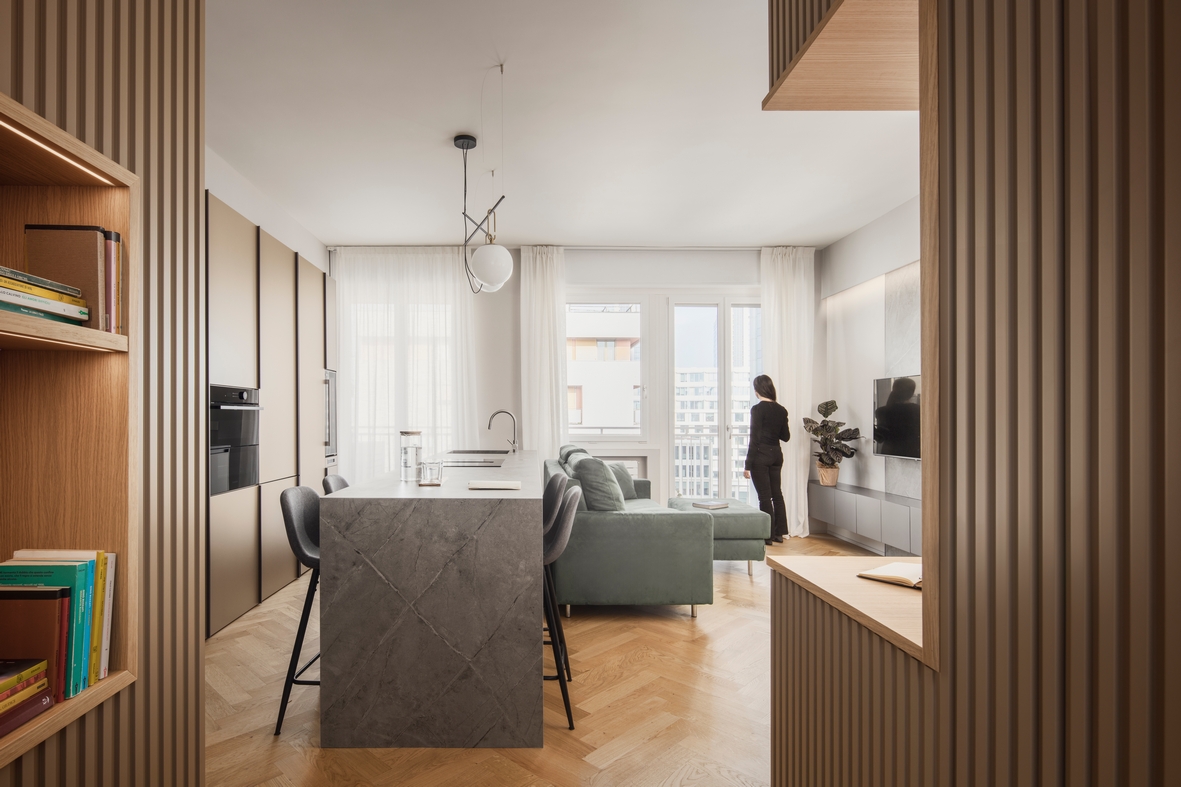 Nella zona giorno, gli arredi definiscono le diverse funzioni grazie alla loro disposizione strategica. Una grande isola effetto pietra delimita la cucina, incorporando lavello, fuochi e tavolo da pranzo. Dietro di essa, colonne rivestite con la stessa boiserie dell’ingresso ospitano elettrodomestici e una cantinetta per i vini. Il divano, adiacente all’isola, divide la zona living, valorizzata da un rivestimento lapideo, e offre una vista sull’ingresso, dove è stata allestita una postazione per l’home-working.