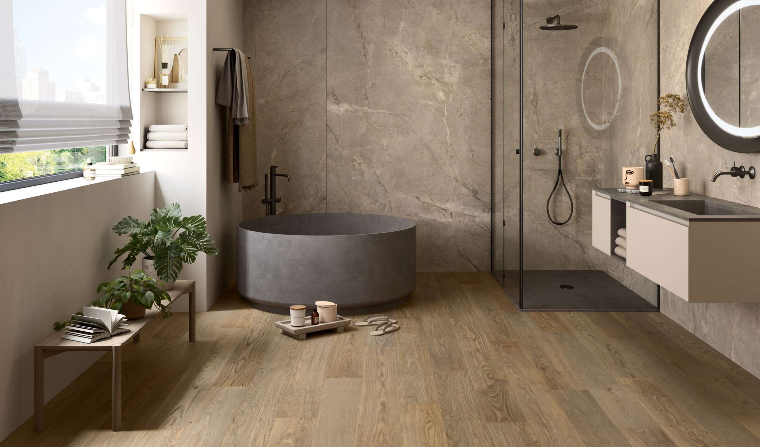 In questa scenografia dove il tempo sembra fermarsi, la luce naturale avvolge delicatamente lo spazio illuminando il pavimento in legno realizzato con il parquet Rovere Selce di Woodco. Caratterizzato da tonalità calde e soffuse e da venature dai movimenti regolari, il pavimento non solo si armonizza nell’ambiente richiamando le sfumature delle pareti in pietra, ma regala anche un’esperienza tattile suggestiva, invitando le persone a camminare a piedi nudi e a lasciarsi alle spalle le fatiche della giornata.