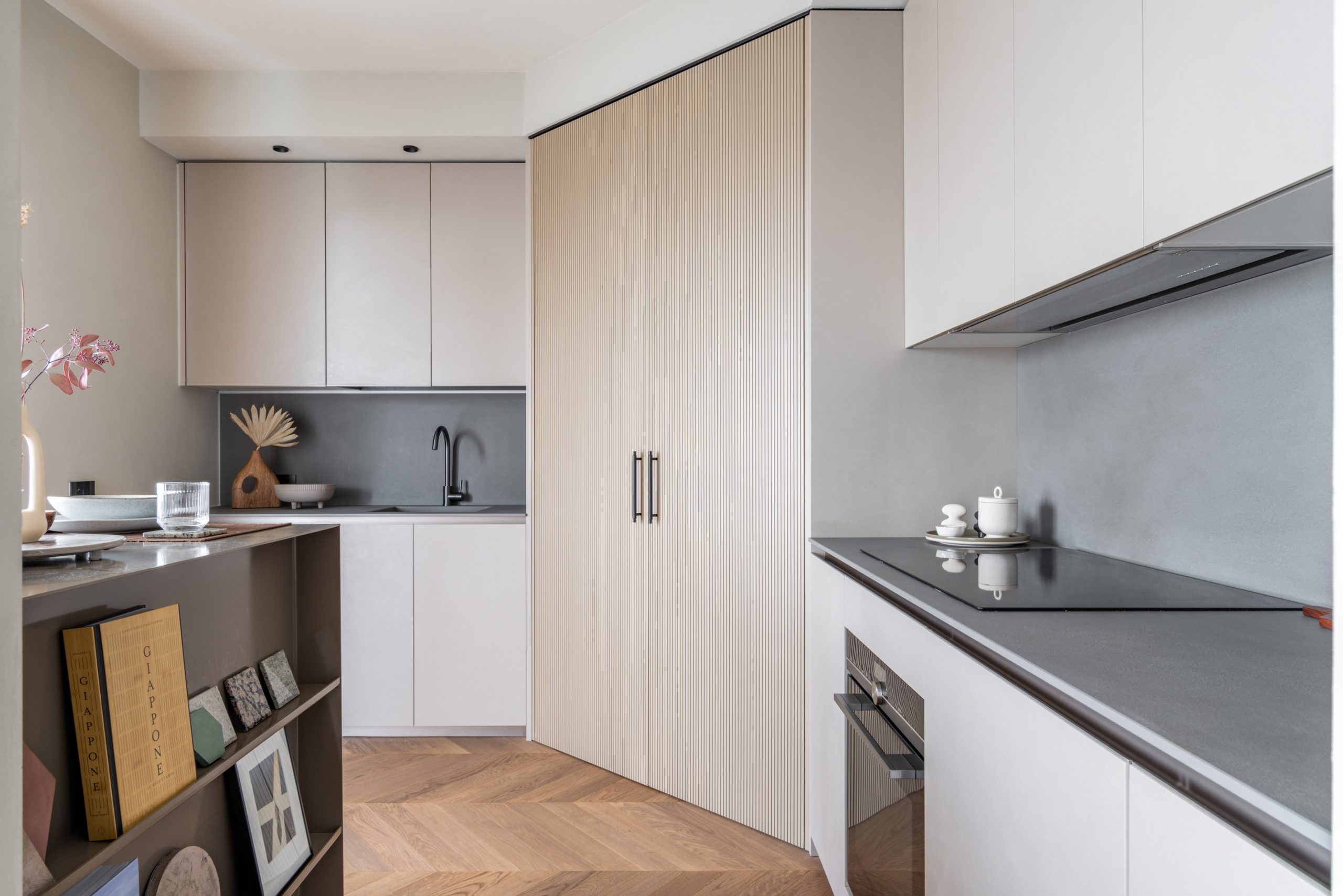 Nell’appartamento, di circa 90 mq, gli arredi sono incorporati nell’architettura e separano spazi e funzioni in maniera consapevole. La loro progettazione, iniziata sui disegni in pianta, è stata guidata dal pavimento in legno, una pregiata spina ungherese firmata Woodco.