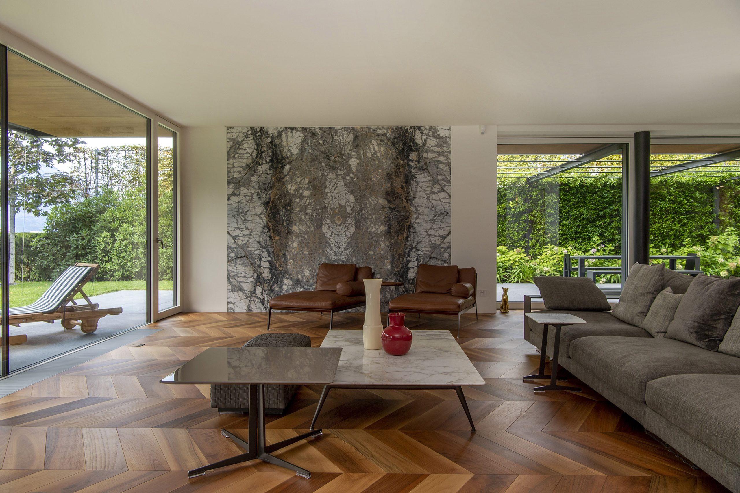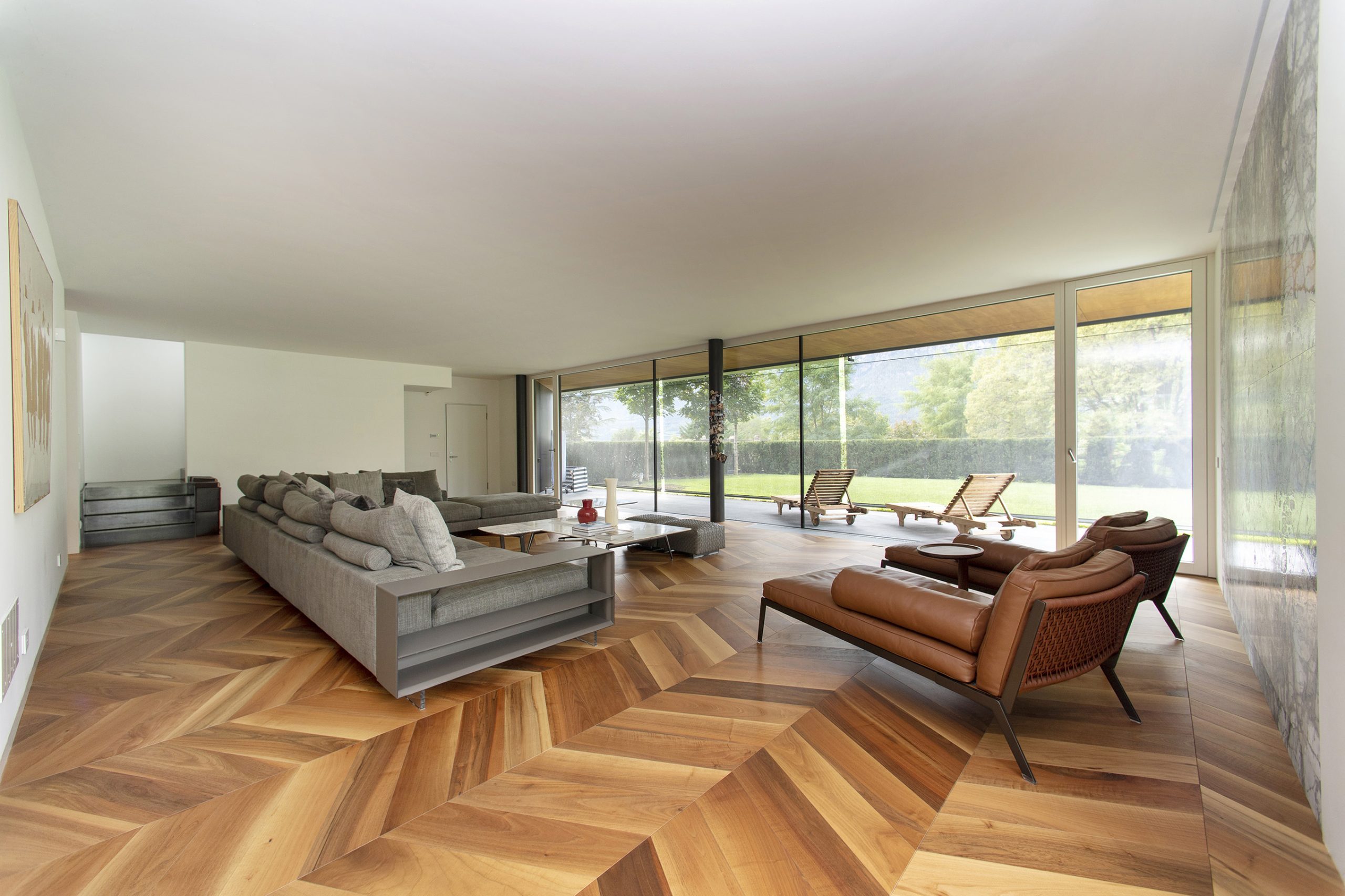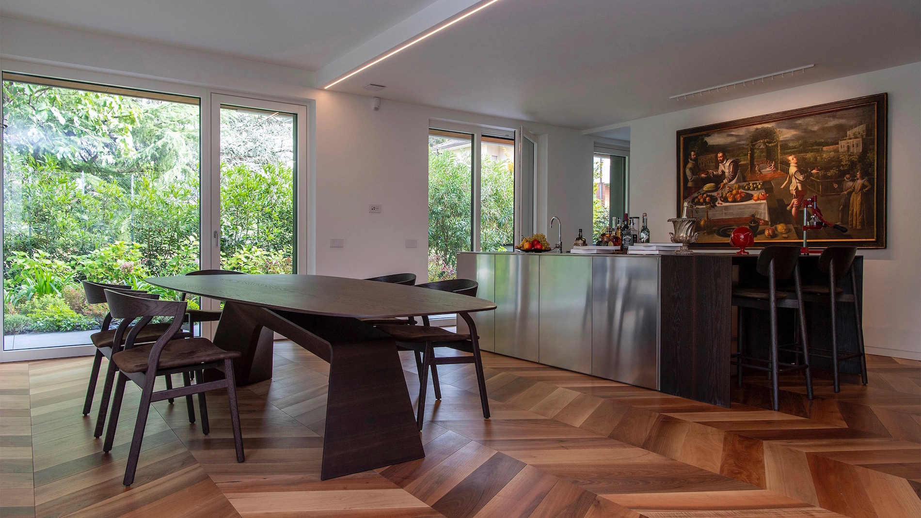 Il parquet di Woodco è stato scelto come rivestimento principale dell’abitazione. Nella zona giorno, quindi in tutto il primo piano, il parquet in noce naturale Woodco dona ritmo e vivacità agli ambienti grazie ad una pregiata posa a spina ungherese. Il formato importante della spina, con larghezza pari a quella di una tavola (180 mm), è stato scelto direttamente dalla committenza.