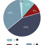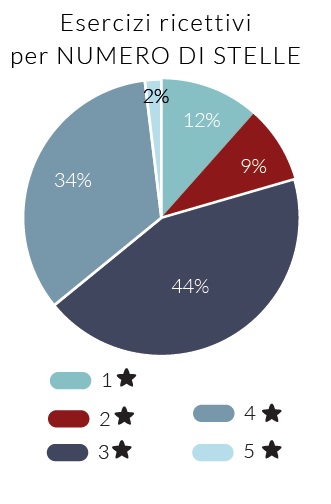 Quasi la metà del totale degli esercizi italiani, invece, è costituita dagli hotel a 3 stelle (46%), ai quali seguono i 4 stelle (18%), i 2 stelle (17%) e quelli ad 1 stella (8%).