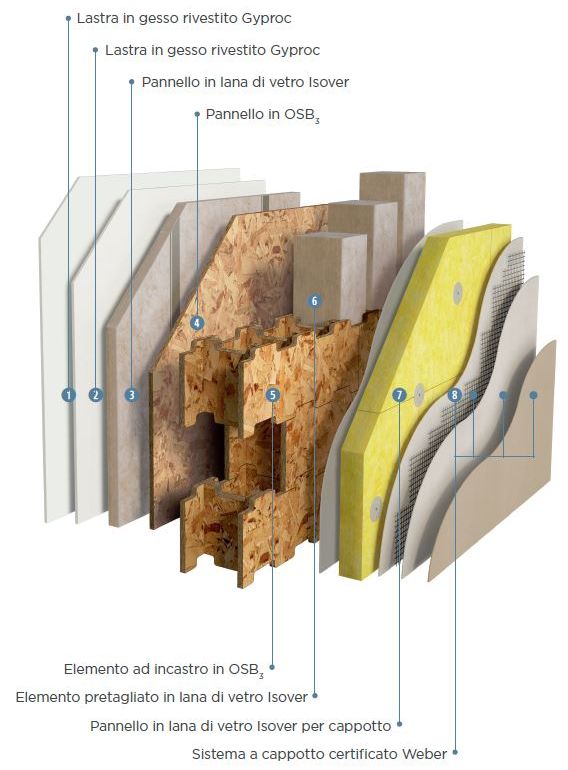Xyliving è il sistema costruttivo in legno brevettato da Saint-Gobain composto da elementi modulari in legno di pioppo. Il sistema a incastro di elementi sovrapposti configura una struttura a telaio ligneo posata a secco.