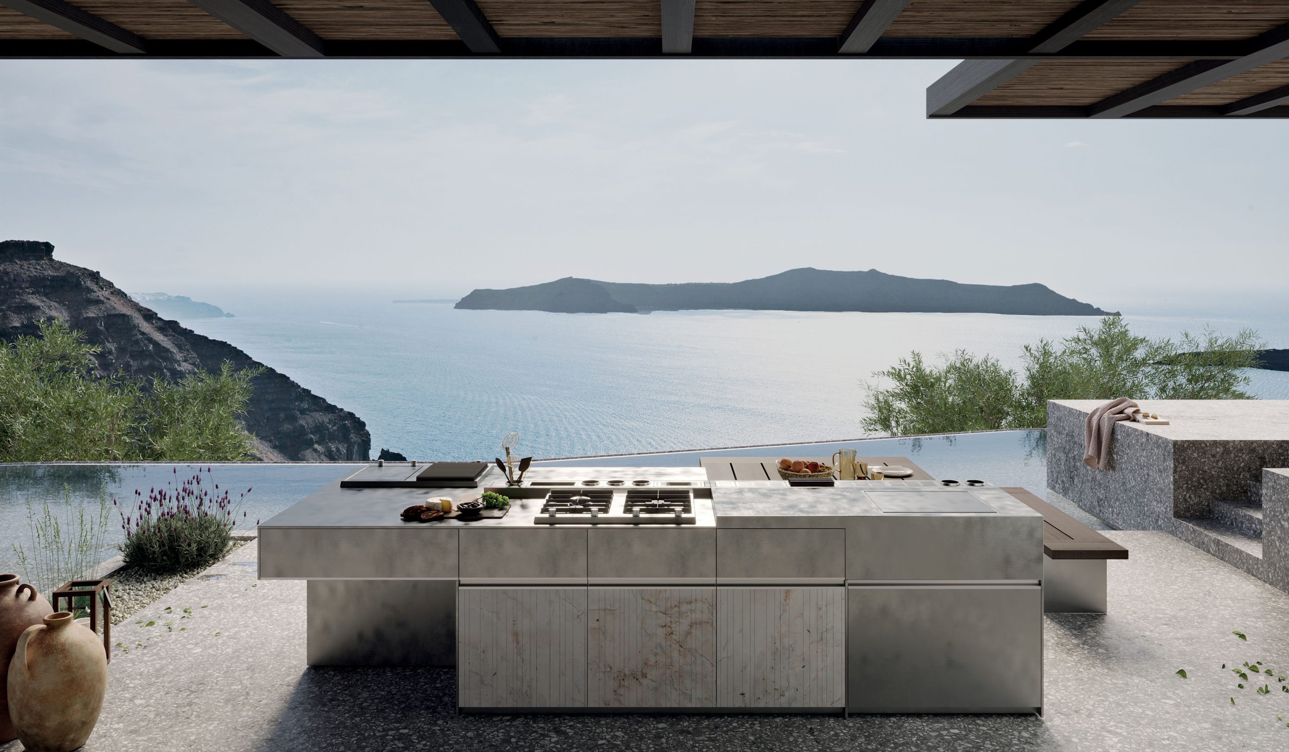 Le linee geometriche, sviluppate in orizzontale e in verticale, rappresentano il tratto distintivo e creano un gioco di volumi pieni e vuoti rendendo Loggia Out_Santorini una cucina scultorea. Nel prospetto è scandita da lame in metallo e altri materiali che definiscono i vari ambiti di funzione e di contenimento e ritmata nel top dai diversi livelli progettati in diverse varianti.