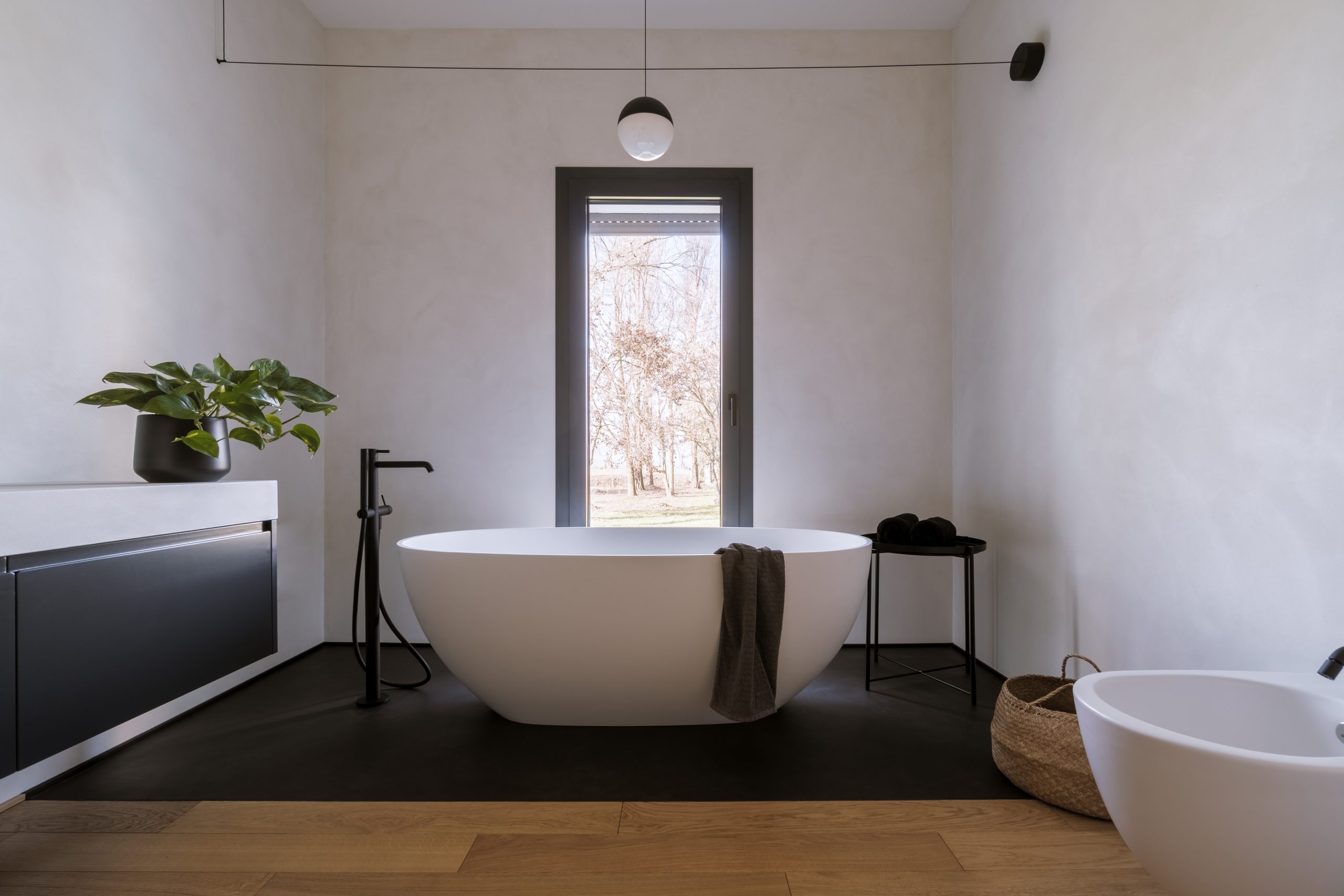 Realizzata in ottone e disponibile in diverse finiture in aggiunta al classico cromato, nelle sale da bagno di Casa Loti lo studio ZDA ha optato per il nero opaco, elegante e materico, in perfetta sintonia con il contesto abitativo.