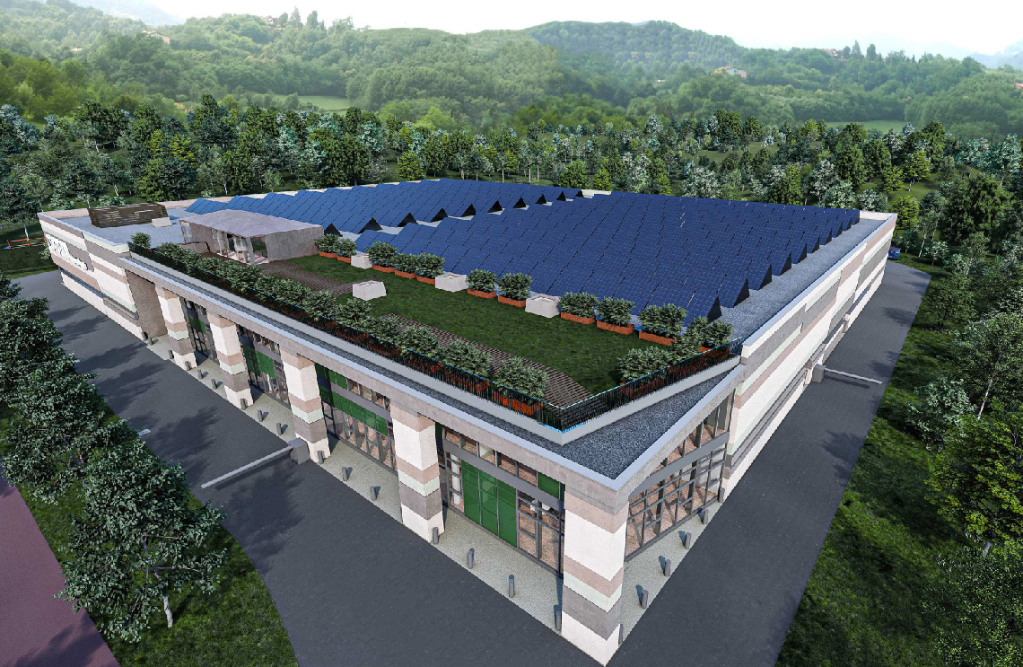 Colori e materiali esterni saranno scanditi da fasce irregolari con combinazioni di colori naturali, perfettamente integrati con quelli del paesaggio circostante. A rafforzare il carattere sostenibile dell’edificio è, infine, la copertura verde, dove troverà spazio l’orto a disposizione dei dipendenti, e la cui valenza etica, oltre che estetica, isolerà la struttura proteggendola dalle dispersioni termiche, e drenerà le acque piovane per il riutilizzo ai fini dell’irrigazione e per il sistema di riequilibrio idrico del territorio.